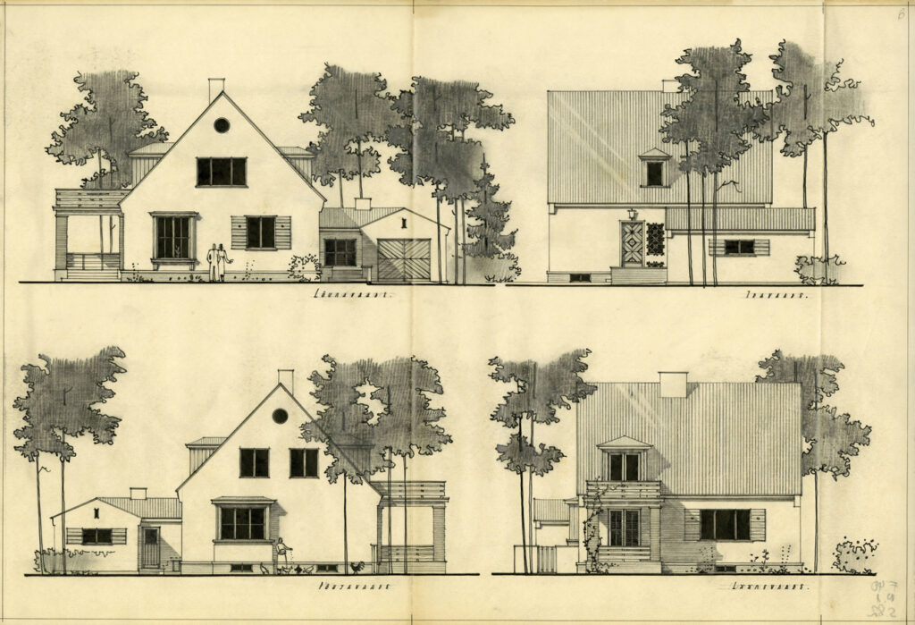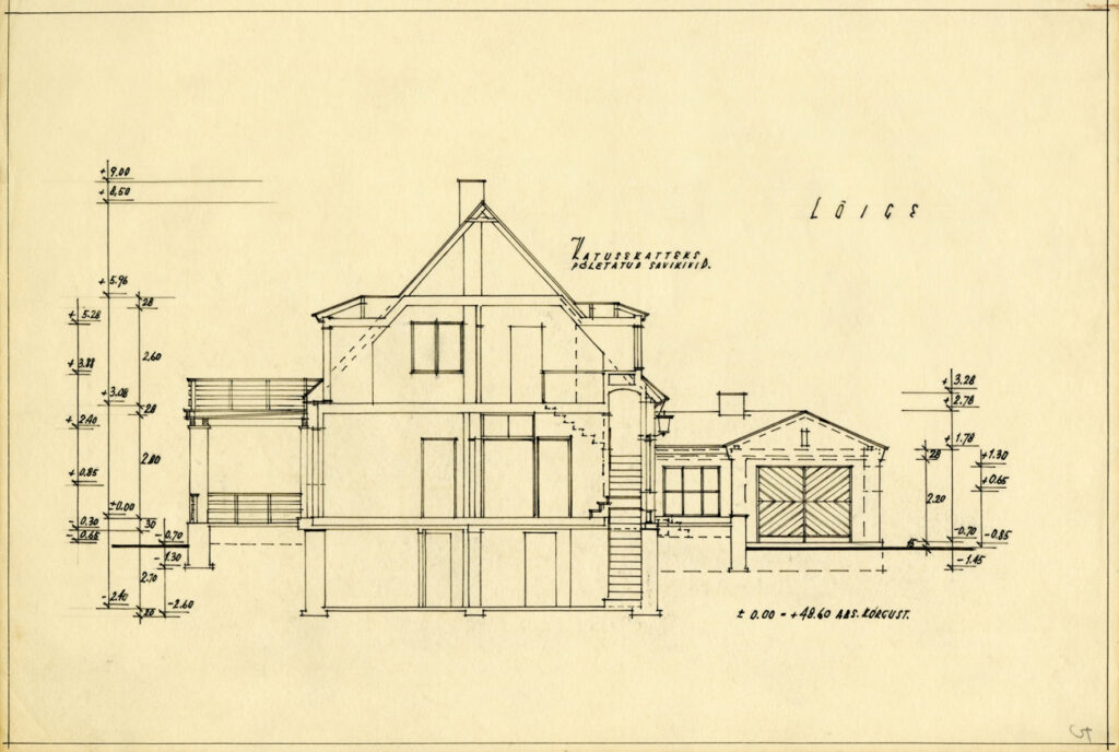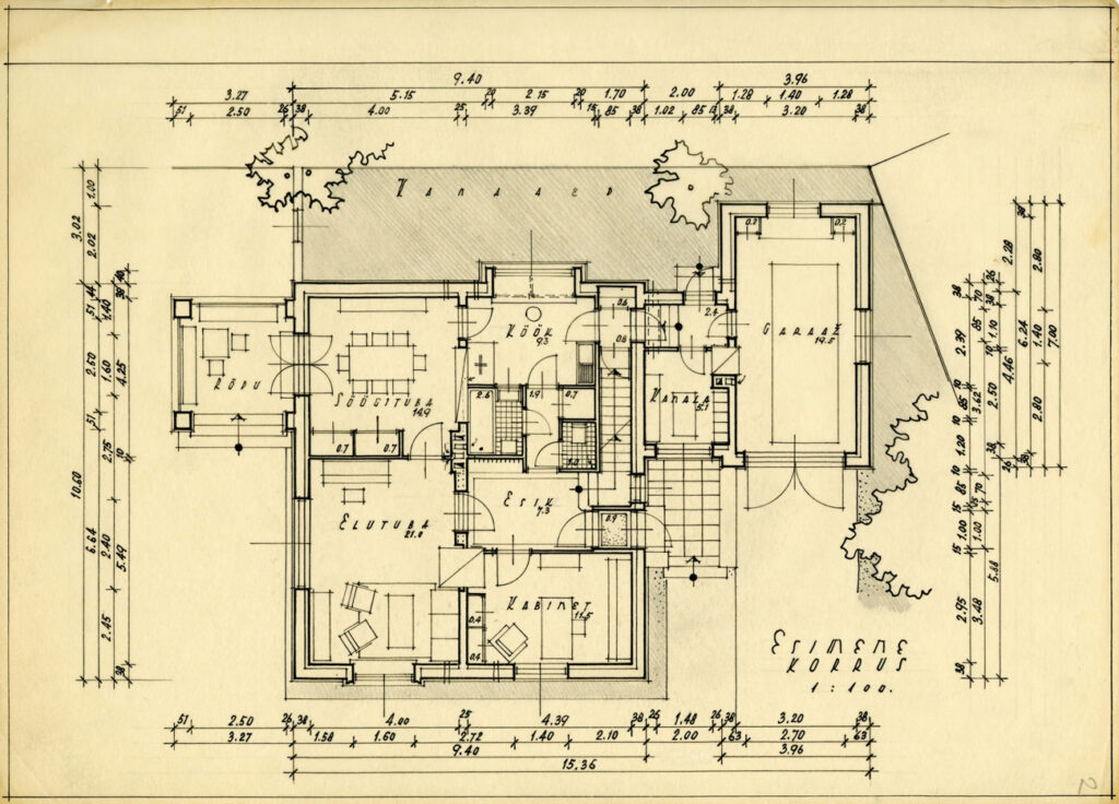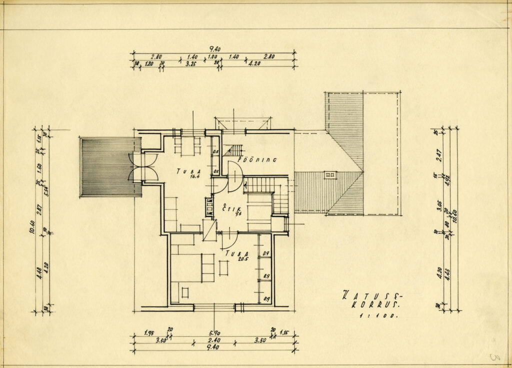There is a recognisable style to the dwellings erected in Estonia’s immediate post-war years. These stone buildings with tall gabled roofs and raised gutter-lines can be found all across the country. Their construction derives from traditional German heimat architecture, intended to give residents a cosy sense of home with the help of small elements such as romantic shutters. The style also pleased the Stalinist regime: it was sufficiently unlike the dominant pre-war flat-roofed structures, which carried “unfit” Western European values. The project was donated to the museum by Maria Tarvas along with many materials from the family collection in 2006.