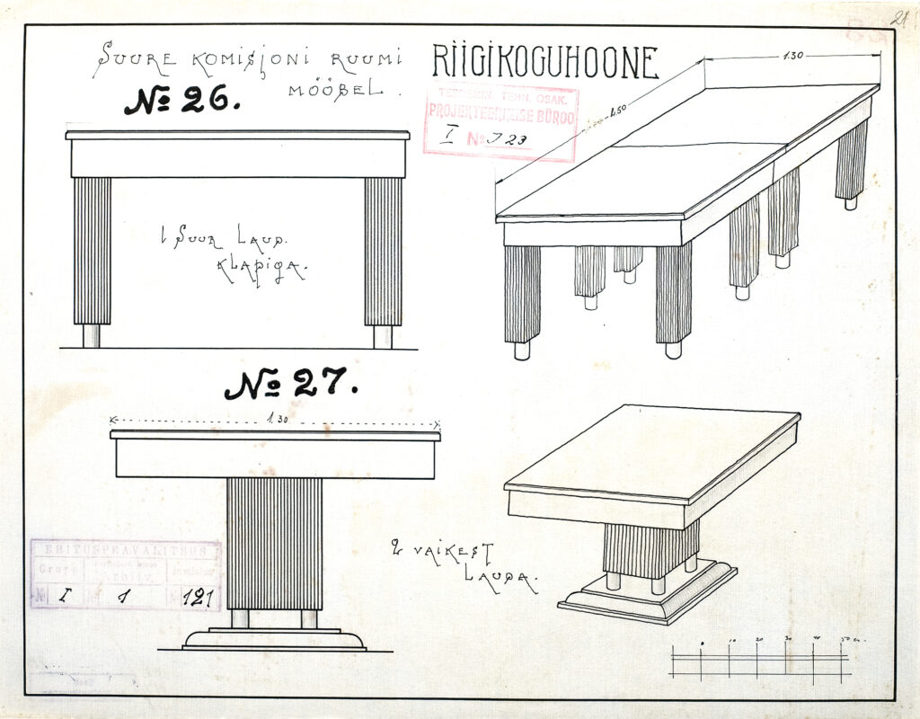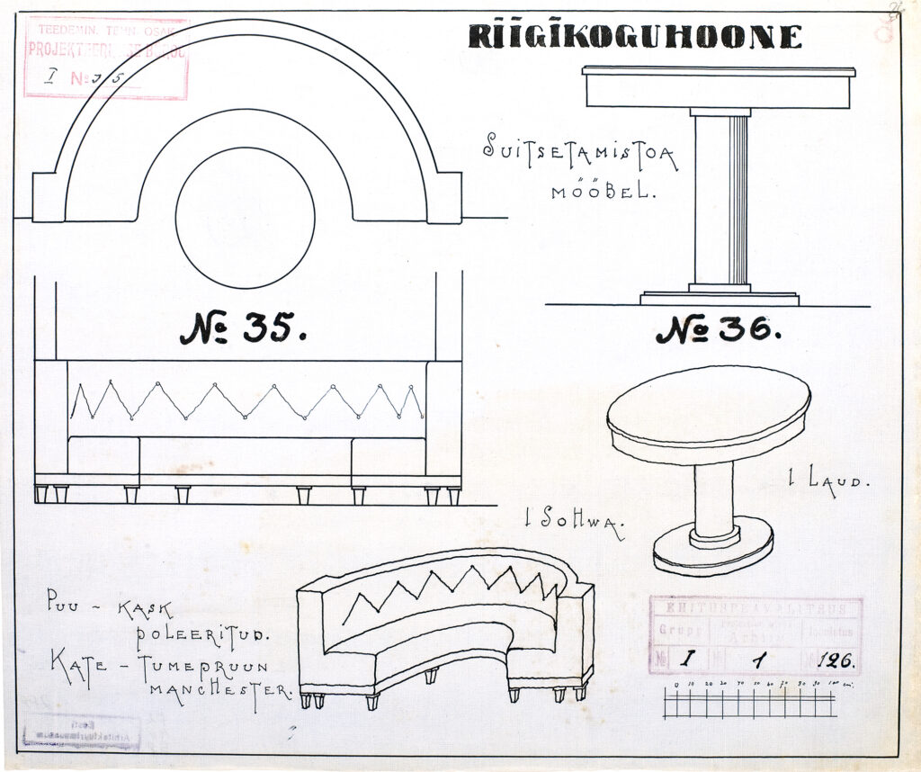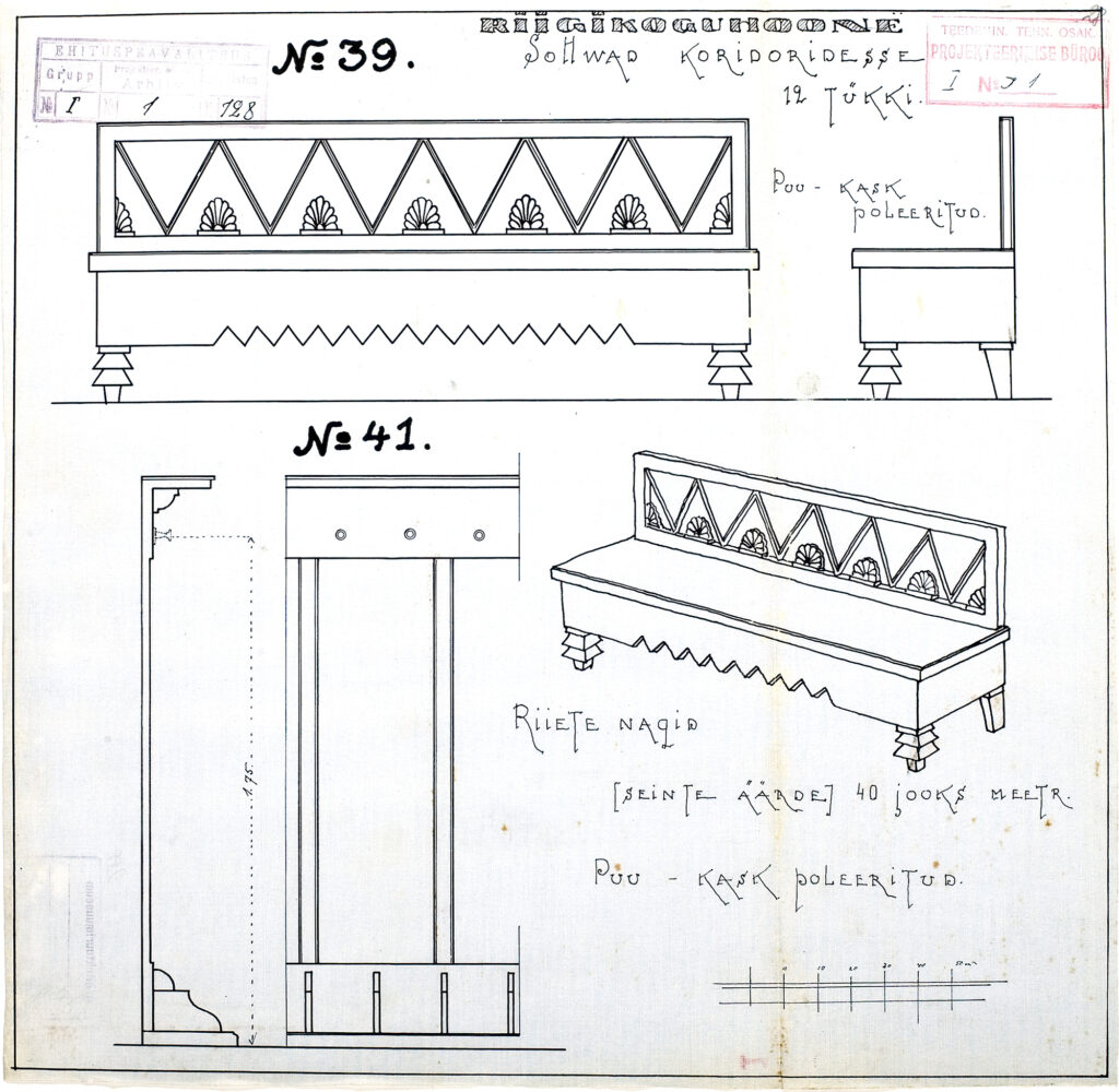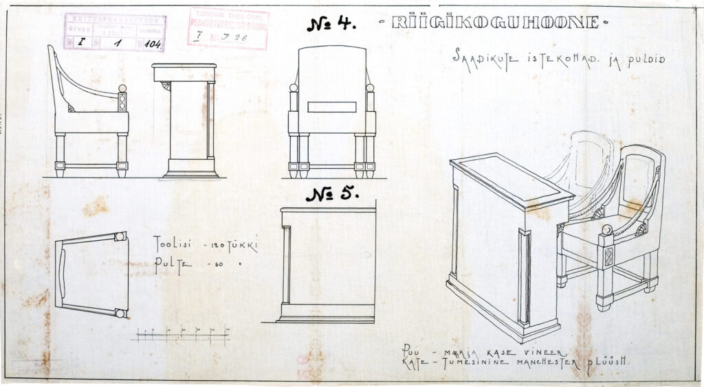 The museum has more than 30 furniture designs for the Parliament building, ranging from the podium in the sitting room to the coat racks. The original drawings come from the archives of the former Ministry of Roads and were transferred to the museum in 1992. Text: Anne Lass